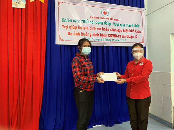 Ngày 06/10/2021, Hội Chữ thập đỏ Thành phố tiếp tục hành trình trao gửi yêu thương, hỗ trợ nguồn lực góp phần đảm bảo đời sống cho các đối tượng yếu thế bị ảnh hưởng bởi dịch bệnh Covid-19, ưu tiên các hộ gia đình là hội viên Chữ thập đỏ. Theo đó, chương trình đã thực hiện trao tặng 400 suất tiền mặt, mỗi suất trị giá 500.000 đồng cùng với thư thăm hỏi, động viên của Ban Thường vụ Hội Chữ thập đỏ TP. Hồ Chí Minh. Các suất hỗ trợ được phân bổ đều tại Quận 1, Quận 8, Quận 12 và huyện Hóc Môn. Tổng giá trị thực hiện là 200 triệu đồng. Đây là hoạt động nhân đạo hết sức cần thiết và được tổ chức kịp thời trong bối cảnh đời sống người dân vẫn còn chịu nhiều ảnh hưởng bởi dịch bệnh Covid-19.