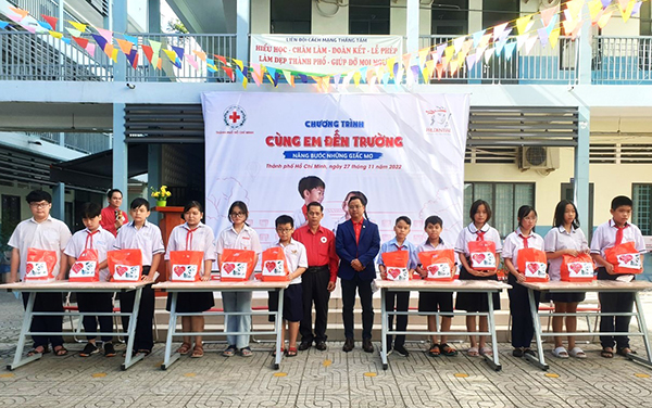 Ông Trần Văn Tuấn – Phó Chủ tịch Hội Chữ thập đỏ Thành phố Hồ Chí Minh trao tặng quà cho các em học sinh.