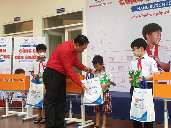Ông Trương Minh Hùng – UVTV, Trưởng Ban Công tác xã hội và Chăm sóc sức khỏe Hội Chữ thập đỏ Thành phố Hồ Chí Minh trao quà cho học sinh khó khăn.