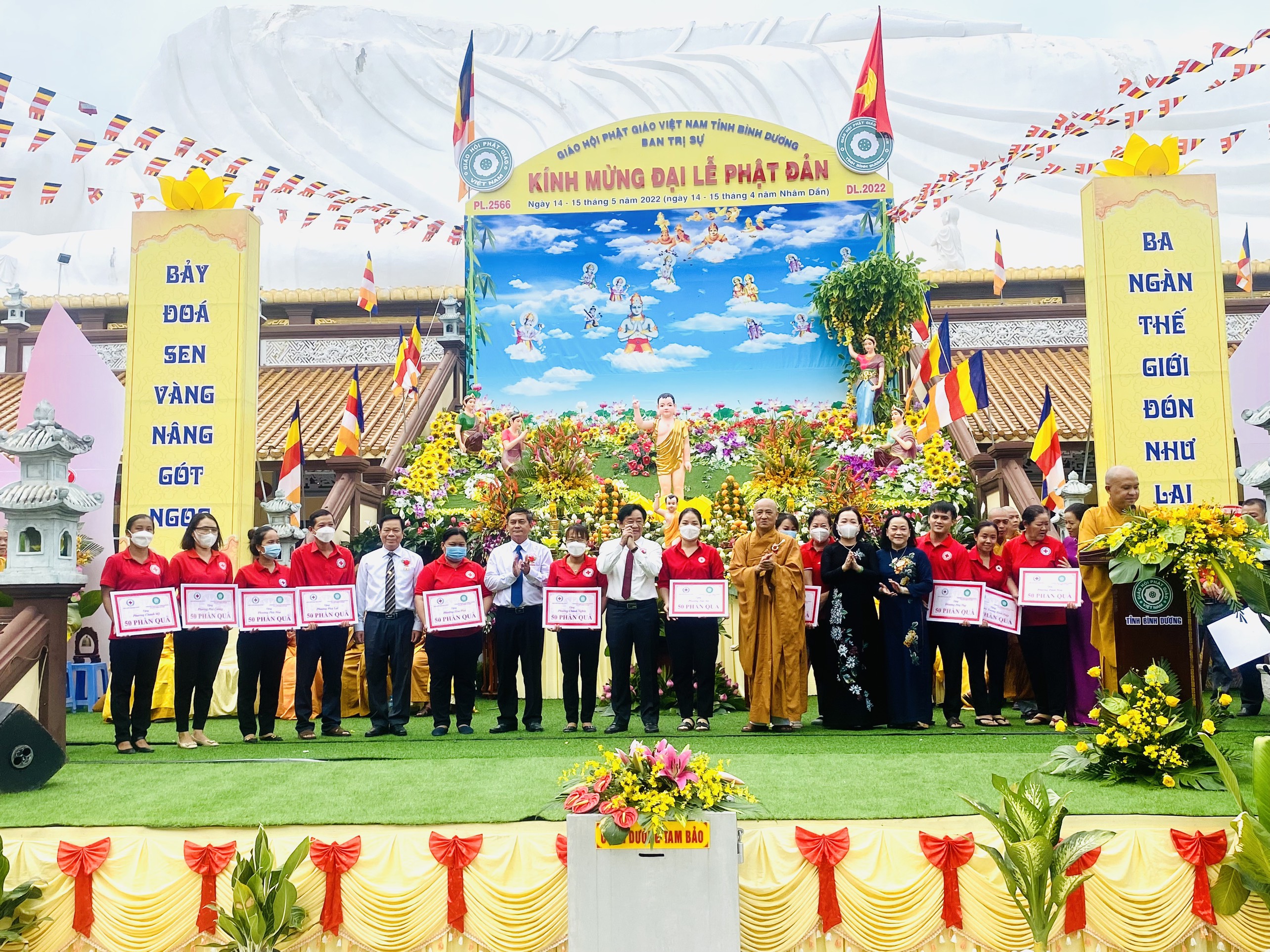 Lãnh đạo tỉnh cùng Ban trị sự Giáo hội Phật giáo Việt Nam tỉnh trao bảng tượng trưng hỗ trợ quà cho Hội Chữ thập đỏ 14 phường của TP. Thủ Dầu Một để chuyển đến người dân khó khăn.