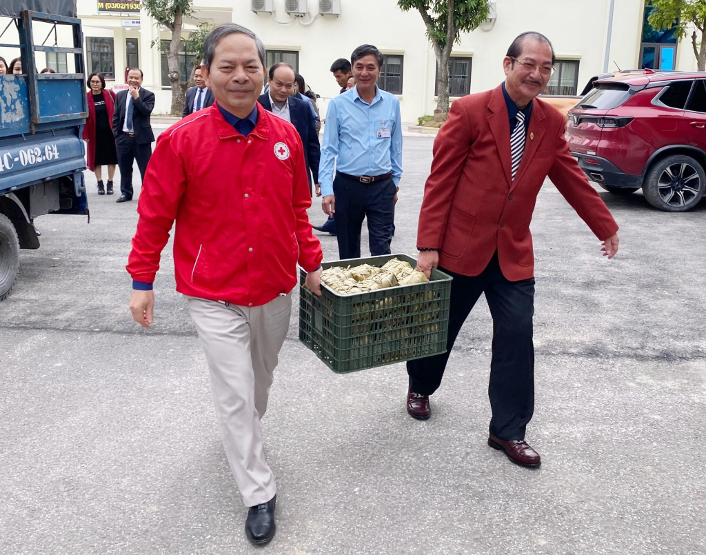 Ông Vũ Hồng Hải, Chủ tịch Hội Chữ thập đỏ tỉnh và ông Đào Duy Hảo, Chủ tịch Hiệp hội Doanh nghiệp TP Cẩm Phả, mang bánh chưng cho bệnh nhân đang điều trị tại Bệnh viện Bảo vệ sức khỏe tâm thần Quảng Ninh.