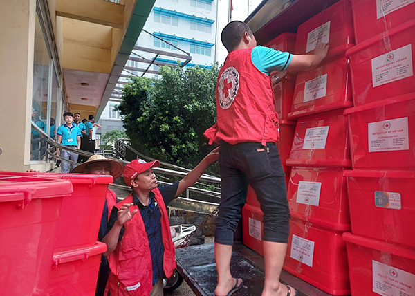 Trung ương Hội Chữ thập đỏ Việt Nam khẩn trương vận chuyển thùng hàng gia đình từ kho tại Hà Nội để kịp đến với bà con Nghệ An và Hà Tĩnh.