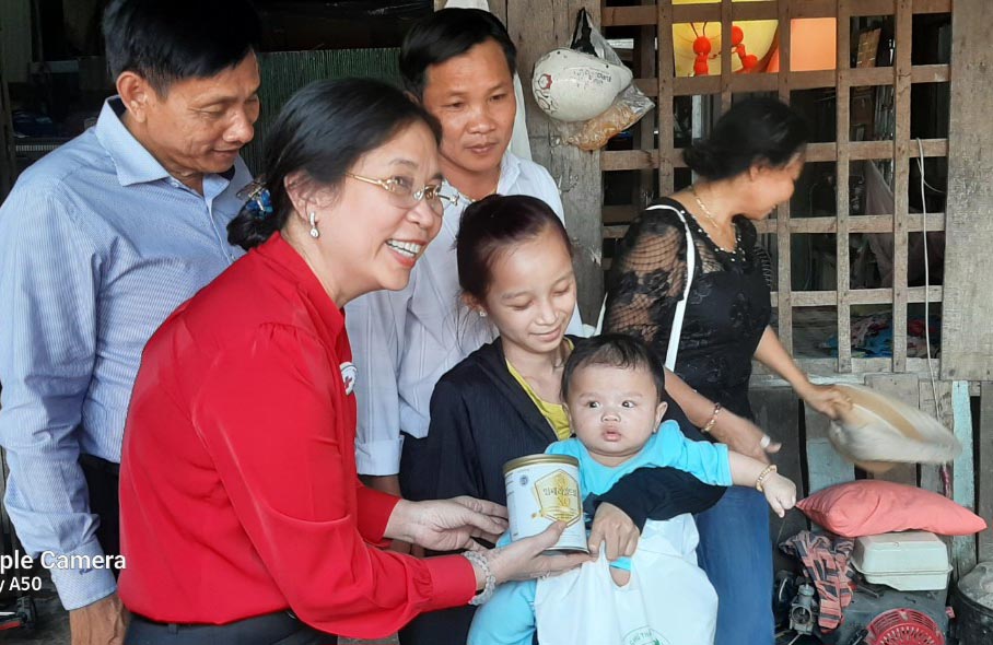 Phó Chủ tịch Trung ương Hội Chữ thập đỏ Việt Nam Huỳnh Thị Xuân Lam tặng sữa cho trẻ em nghèo, suy dinh dưỡng tại xã Bình Hòa Tây, huyện Mộc Hóa, tỉnh Long An