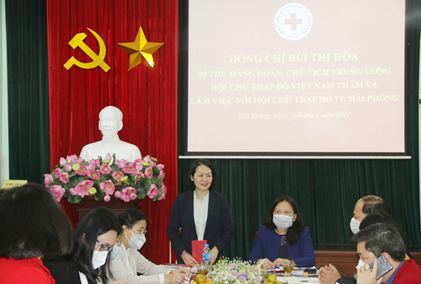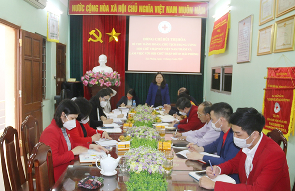 Phát biểu kết luận buổi làm việc, bà Bùi Thị Hòa – Bí thư Đảng đoàn, Chủ tịch Trung ương Hội Chữ thập đỏ Việt Nam ghi nhận, đánh giá cao kết quả mà Hội Chữ thập đỏ thành phố Hải Phòng đã đạt được trong nhiệm kỳ vừa qua, một số nhiệm vụ được Trung ương Hội đánh giá cao, như: Cuộc vận động “Góp những đồng tiền nhỏ vì nghĩa tình lớn, tặng quà đầu xuân giúp bạn nghèo và nạn nhân chất độc da cam”; Xây nhà Chữ thập đỏ cho người có hoàn cảnh khó khăn; Tổ chức các Chợ Nhân đạo, công tác hiến máu tình nguyện, cấp phát túi thuốc cho ngư dân… Thông tin nhanh về nội dung buổi làm việc của Chủ tịch nước Nguyễn Xuân Phúc với Trung ương Hội Chữ thập đỏ Việt Nam về triển khai Tháng Nhân đạo 2022 và một số định hướng của Trung ương Hội trong thời gian gian tới.