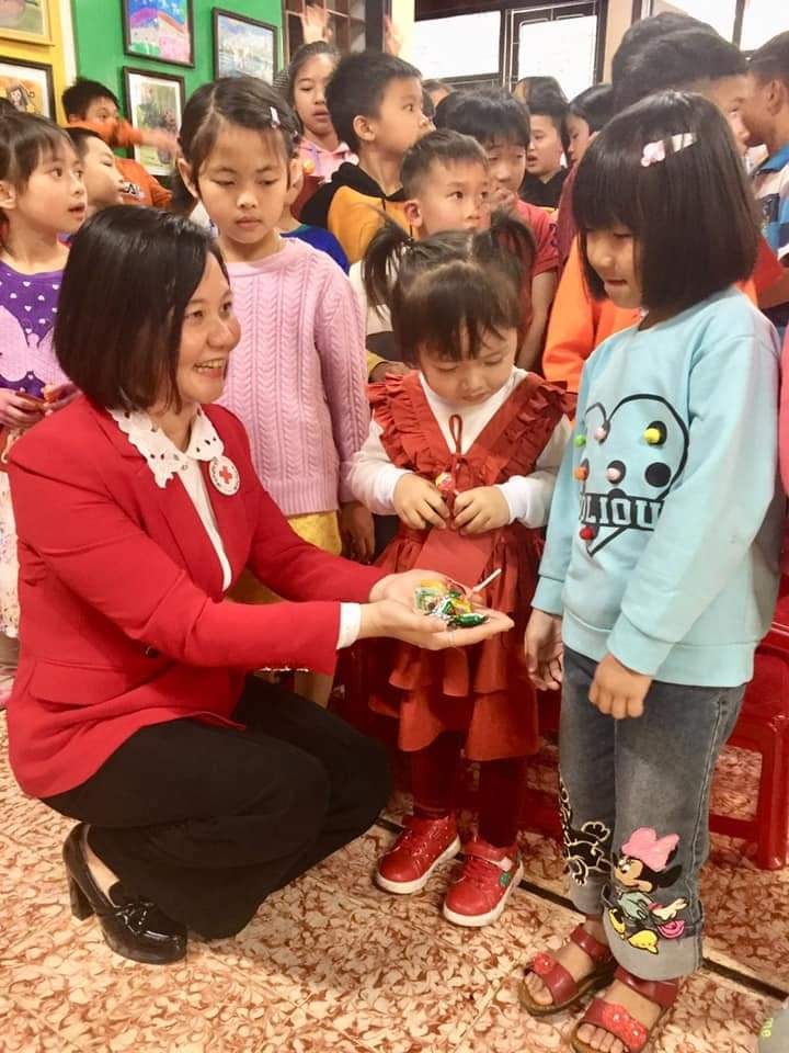 Phó Chủ tịch Hội Chữ thập đỏ Việt Nam Trần Thị Hồng An tặng quà các cháu Làng trẻ SOS Đà Lạt.