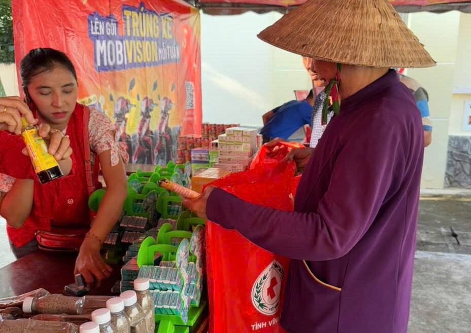 Tại phiên chợ “Tết Nhân ái”, 200 bà con đã được hỗ trợ các suất quà Tết thông qua hình thức phát phiếu mua hàng, mỗi suất trị giá 750.000 đồng. Dịp này, Bệnh viện Mắt Sài Gòn – Vĩnh Long phối hợp tổ chức thăm khám mắt, tư vấn miễn phí và tặng quà cho người dân. Bên cạnh đó, các hộ dân còn nhận được các phần quà từ các gian hàng 0 đồng, bao gồm các nhu yếu phẩm thiết yếu như bánh, kẹo, quần áo, nước tương, cá hộp, sữa, quần áo… góp phần phục vụ nhu cầu hàng ngày và giúp các hộ gia đình có thêm điều kiện đón Tết. Tổng trị giá phiên chợ là 150 triệu đồng.